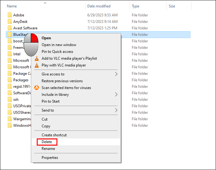 - Find the BlueStacks folder in the new window and delete it.