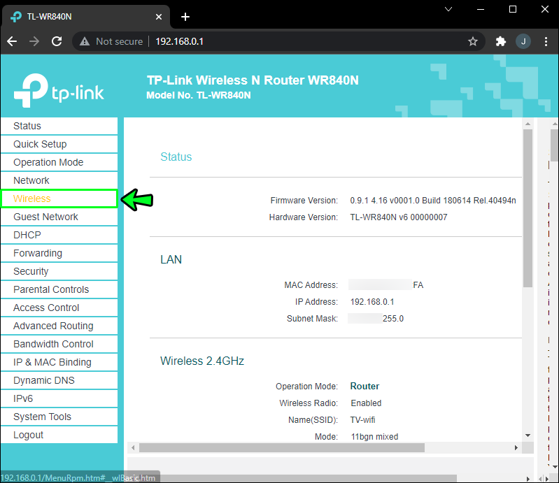 - Look through the navigation options for a section titled “Wireless” or similar.