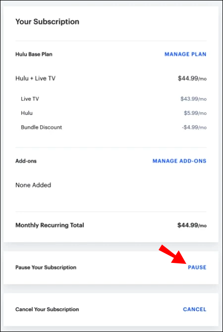 - At the bottom of the section, you’ll see the option to “Pause Your Subscription.” Choose to “Pause.”