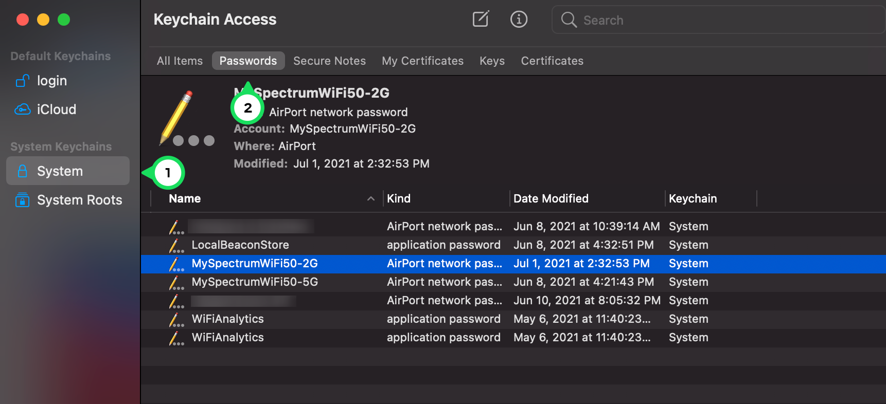 - Select ‘System’ on the left and ‘Passwords’ at the top. Double-click on the network you want to reveal.