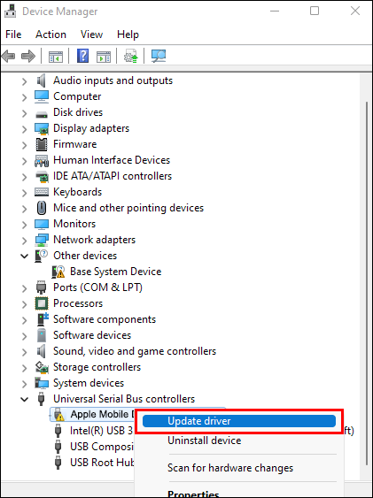 - Look for “Universal Serial Bus Controller” and click the arrow to expand it. “Apple Mobile Device USB Driver” should be under it.