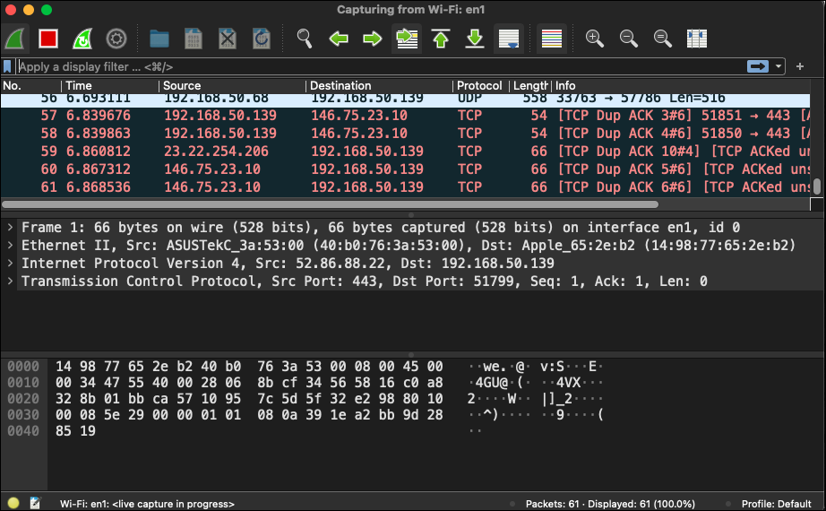 - Select one or more network interfaces then click the shark fin icon in the toolbar or “Capture,” then “Start” in the menu bar.