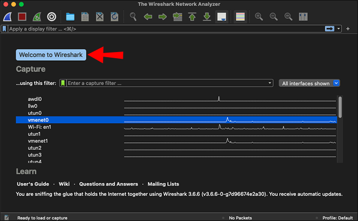 - Look for the Capture Filter bar on the welcome screen. It’s the one directly above your network list.