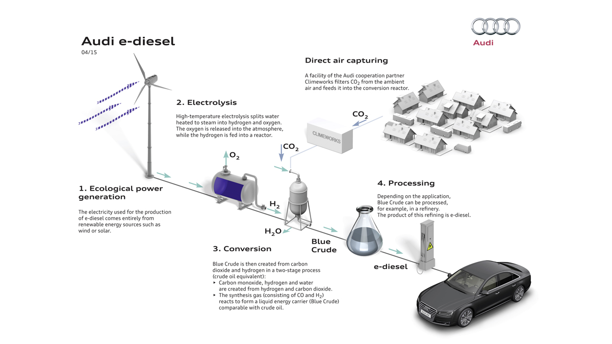 Audi creates its e-diesel through capturing CO2 from the air and using renewable energy to power the electrolysis used for splitting H2O molecules apart. It’s ingenious, but it will never be a viable replacement for standard fuels in combustion engines or as an alternate energy source.