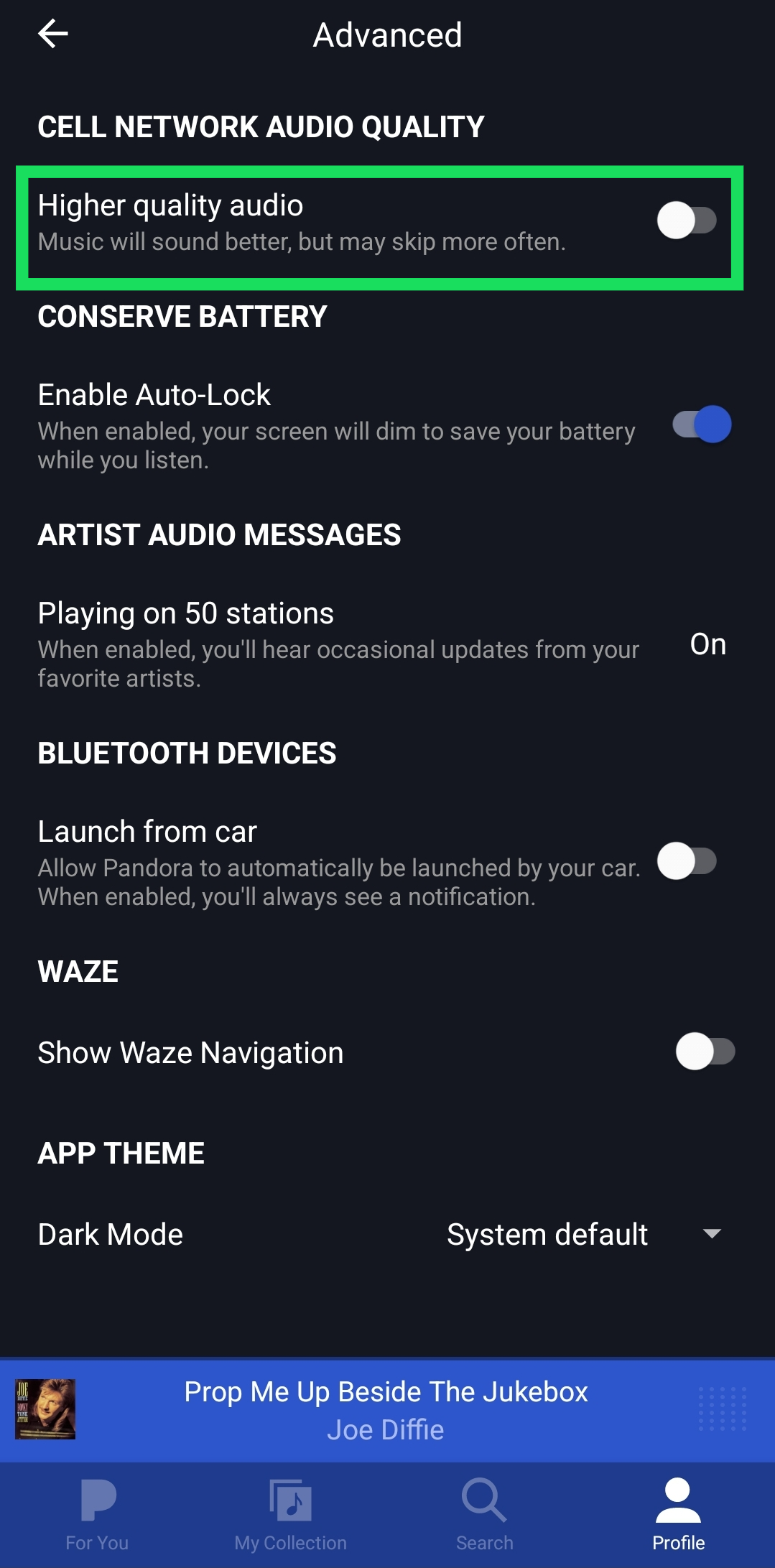 Pandora features an option to help save battery life and cellular data. When the Higher Quality Audio function is enabled, the app prioritizes music features like bass for better listening.