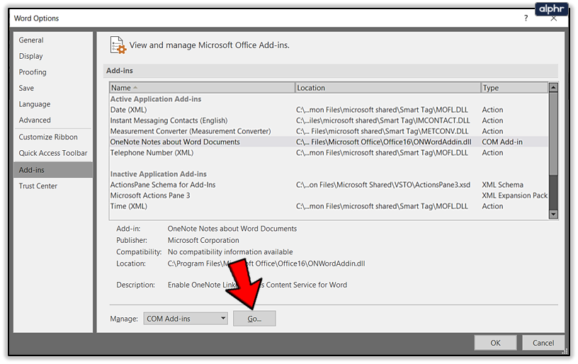 When you set the default font to your preference, repeat the steps, but enable the add-ins by checking the boxes in the Manage list.