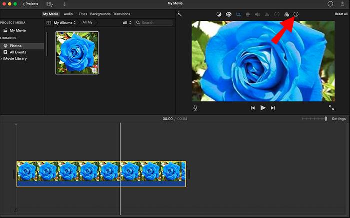 - Once the images are selected, click the information button (a lowercase “i” in a circle) in the top-right corner of the iMovie interface. A toolbar will appear underneath.