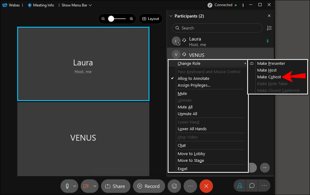 - Select “Make Cohost.” The person will now have the role of host.