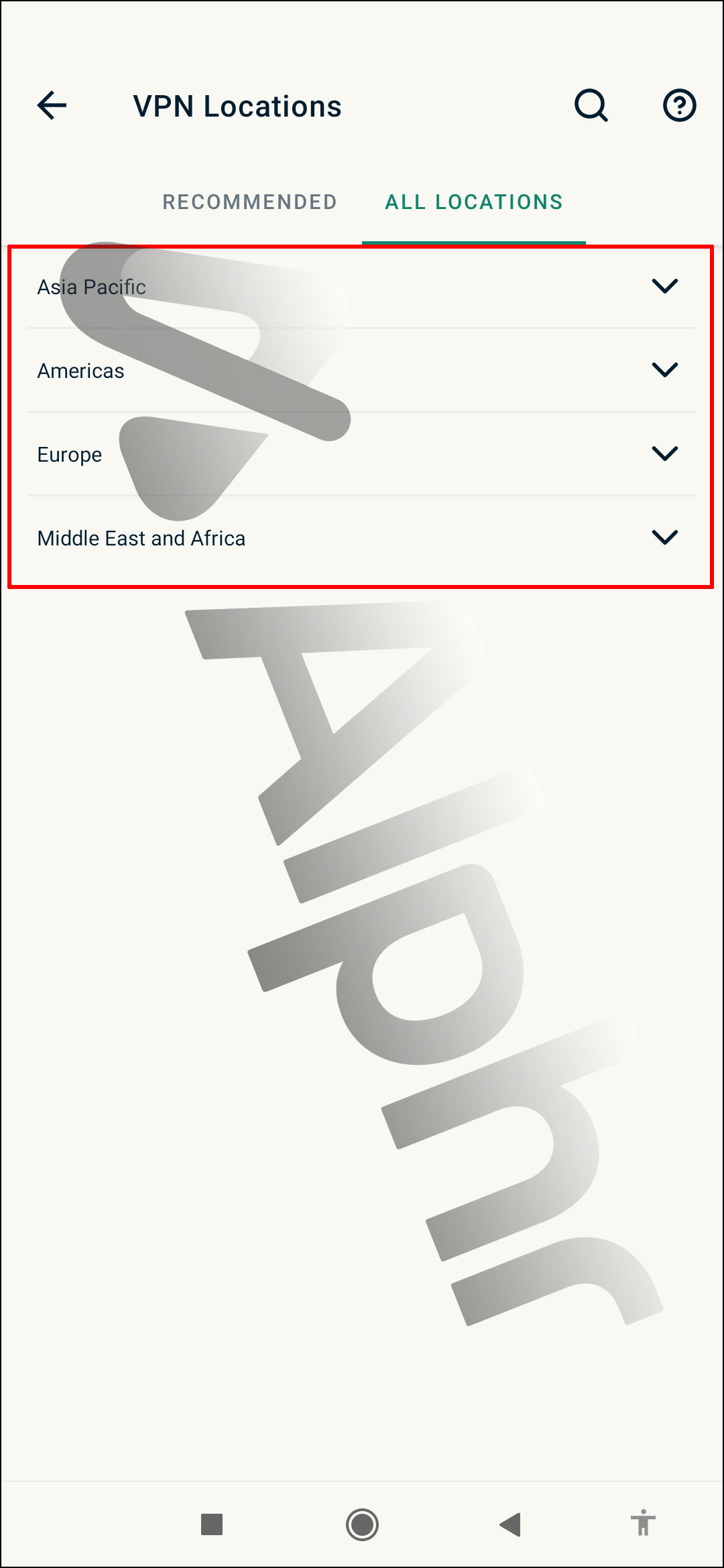 - You’ll see a list of locations sorted by region: “Asia Pacific,” “Americas,” “Europe,” and “Middle East and Africa.” Tap on the area to see its list of countries.