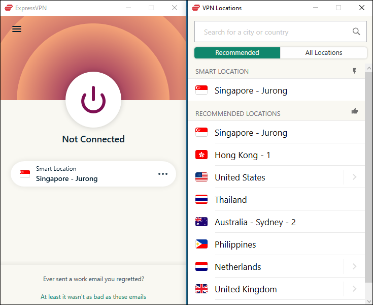 - Select your preferred VPN location under the “Recommended” menu. Alternatively, click on “All locations” for an expanded list of countries.