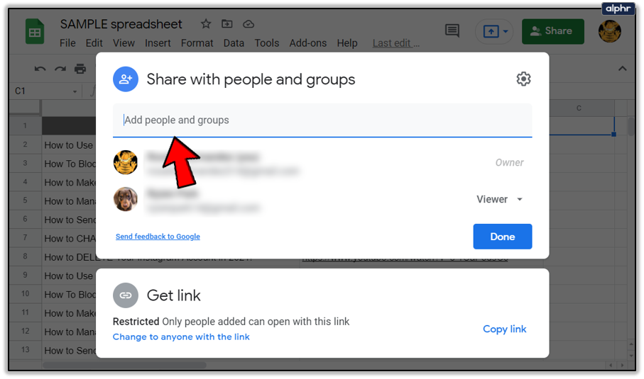 - “Share with people and groups” will open. You’ll see the list of people who have access to the Google Sheet.