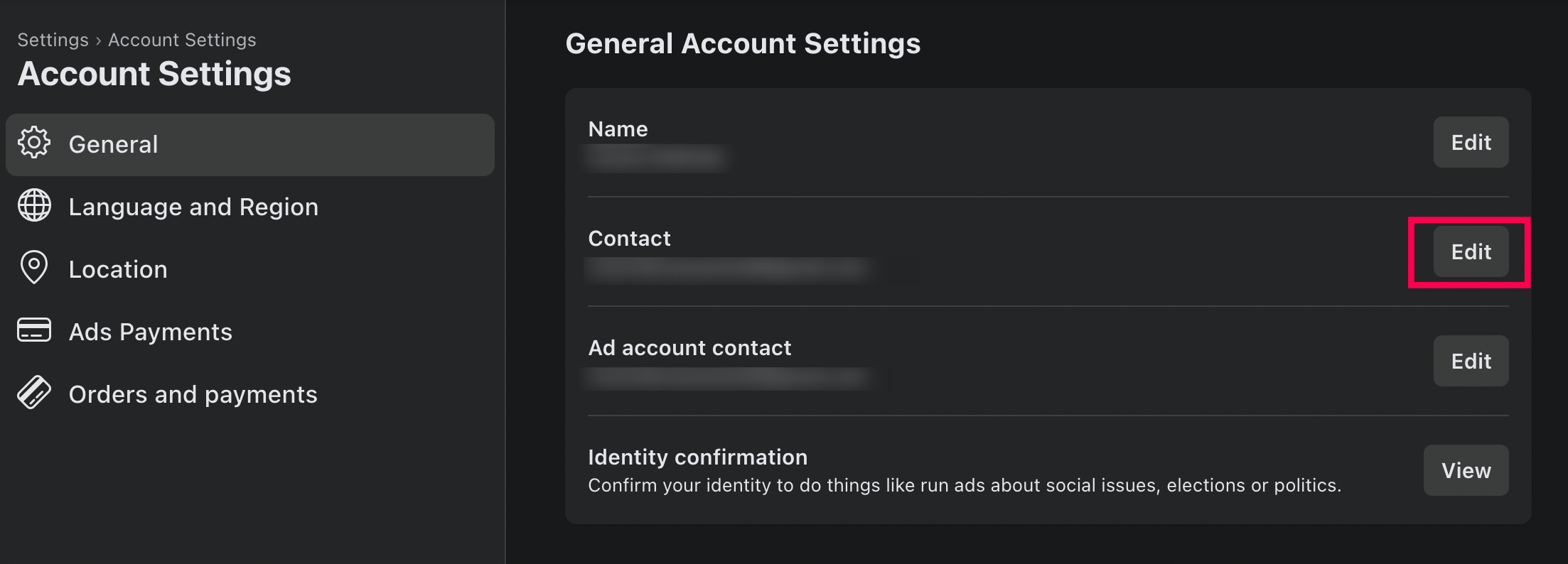 - In General Account Settings, find the Contact field.