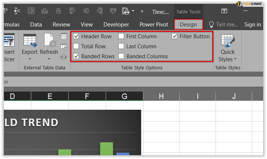 - Go to “Design,” and from there you can check and uncheck all the rows and columns you want shaded.