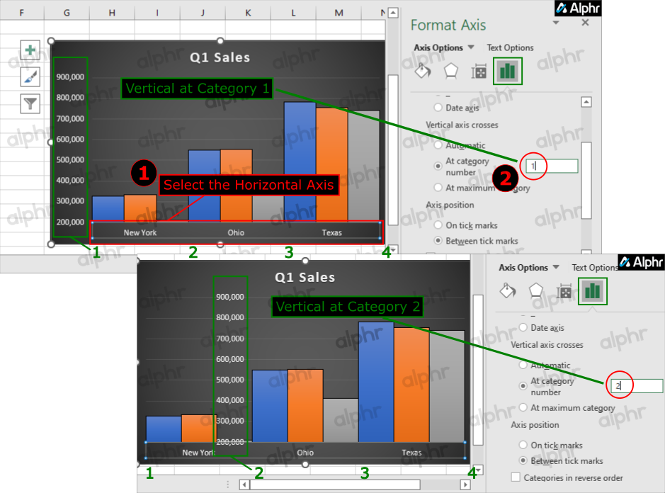 - To change the crosspoint of the Y-axis over the X-Axis, select the “X-Axis” instead. Go to “Axis Options -> Vertical axis crosses,” then choose “Automatic,” “At category number,” or “At maximum category.” If choosing “At category number,” type the value you want to become the crosspoint. Depending on your chart, the “Y-axis” may overlap the previous category.