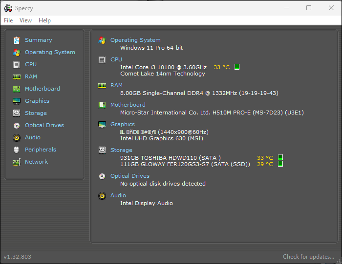- Open Speccy. The initial screen provides a summary of the main system components.