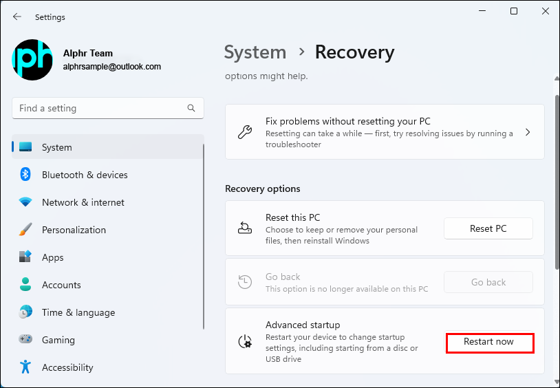 - Select “Recovery” on the right and press “Restart now.”