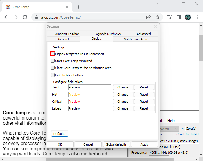 - Mark the checkbox next to “Display temperatures in Fahrenheit.”