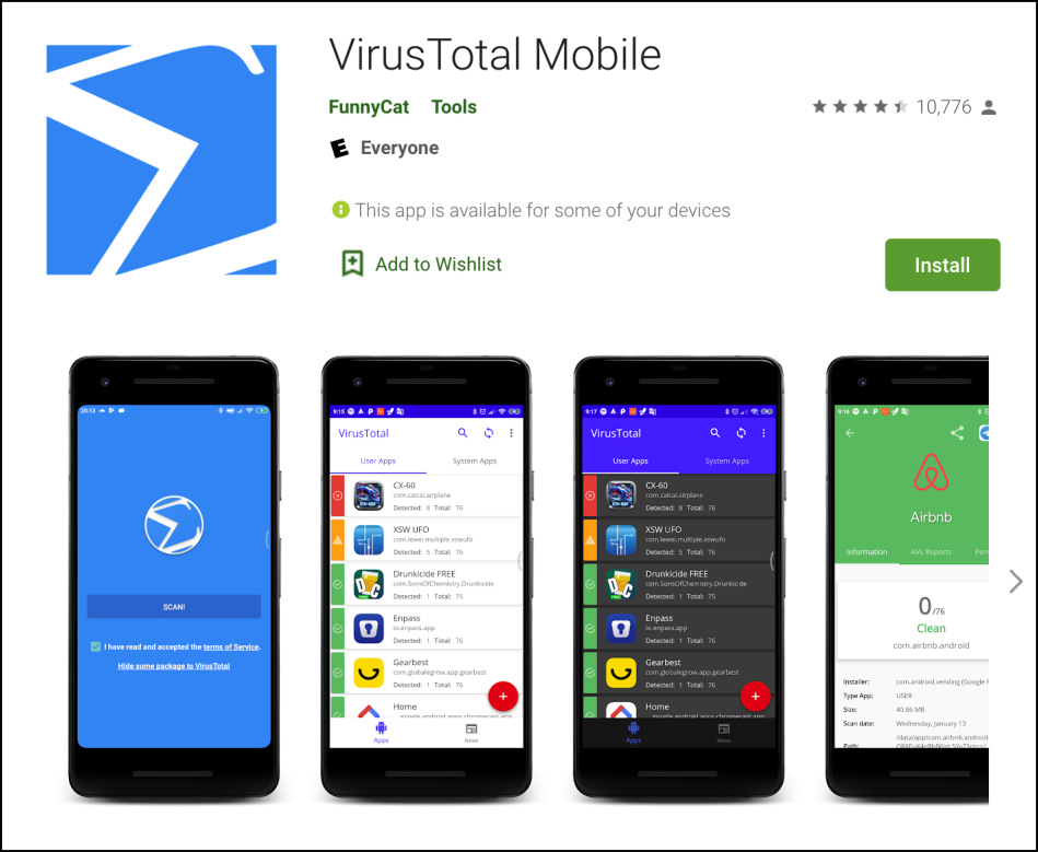 Note: VirusTotal supports third-party developers. The app used here is a mobile app developed/submitted by Funnycat in the Play Store, and it is supported by VirusTotal.