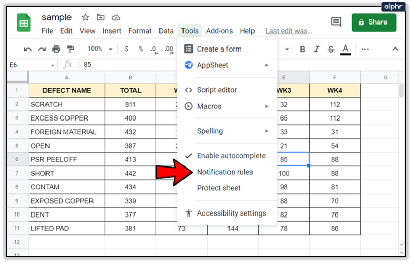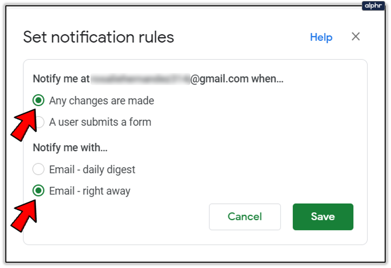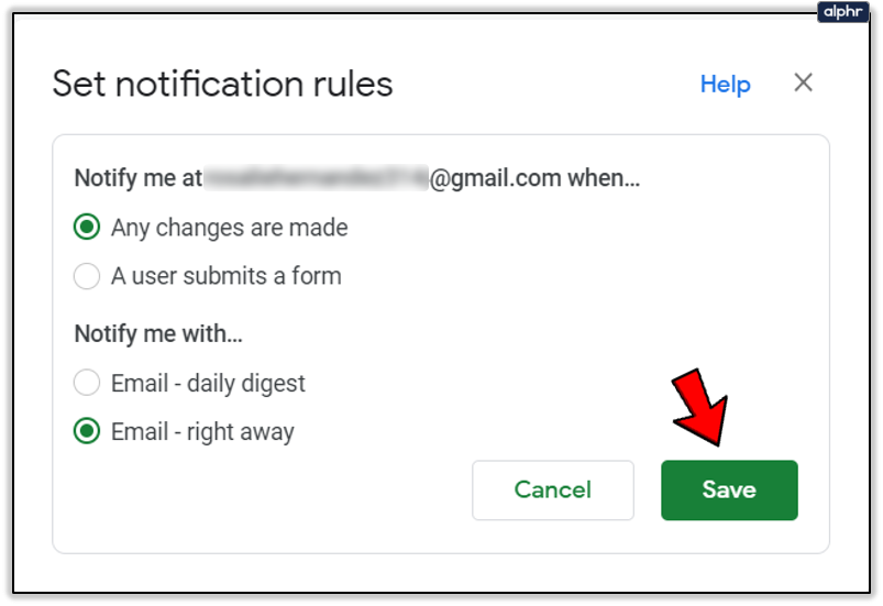 When edits are made to the sheet, the built-in feature “Notification rules” can send you an email right away to inform you of this. You can decide whether you want to receive emails every time someone edits something, or maybe at the end of the day when you can see all the changes.