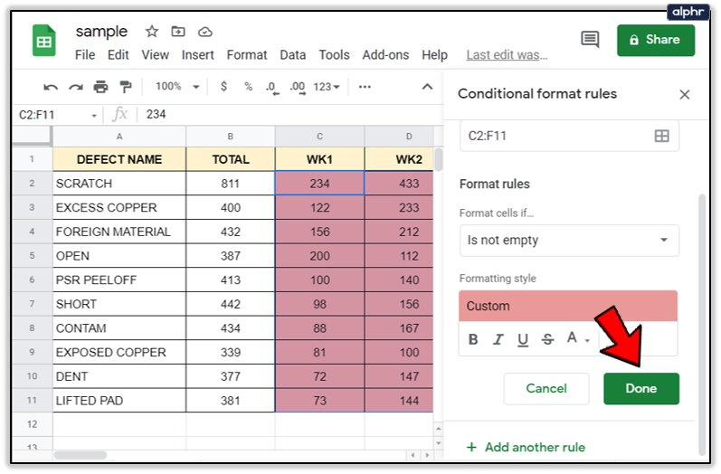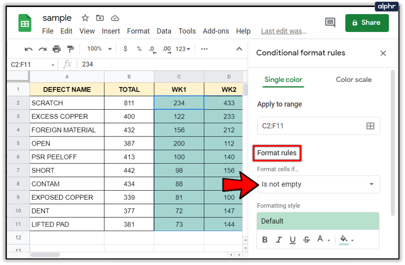 When new information’s added, it can be useful to see that in different color or size. Google Sheet has a function “Conditional formatting” which gives you a visual representation of the added data. To apply conditional formatting, follow these steps: