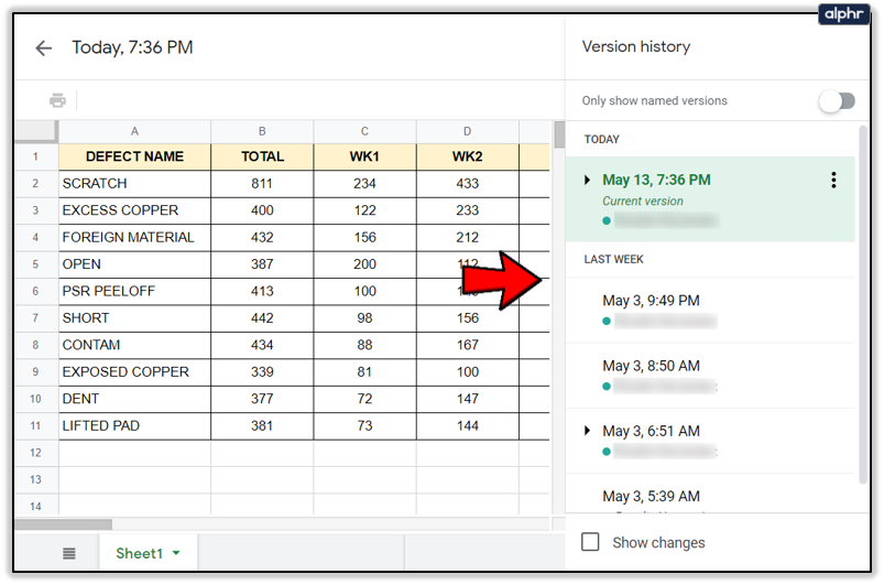Note: Ticking the “Show changes” at the bottom of the bar highlights cells where changes were made in the earlier version. It’s useful to have this option as it allows you to always keep track of new edits.