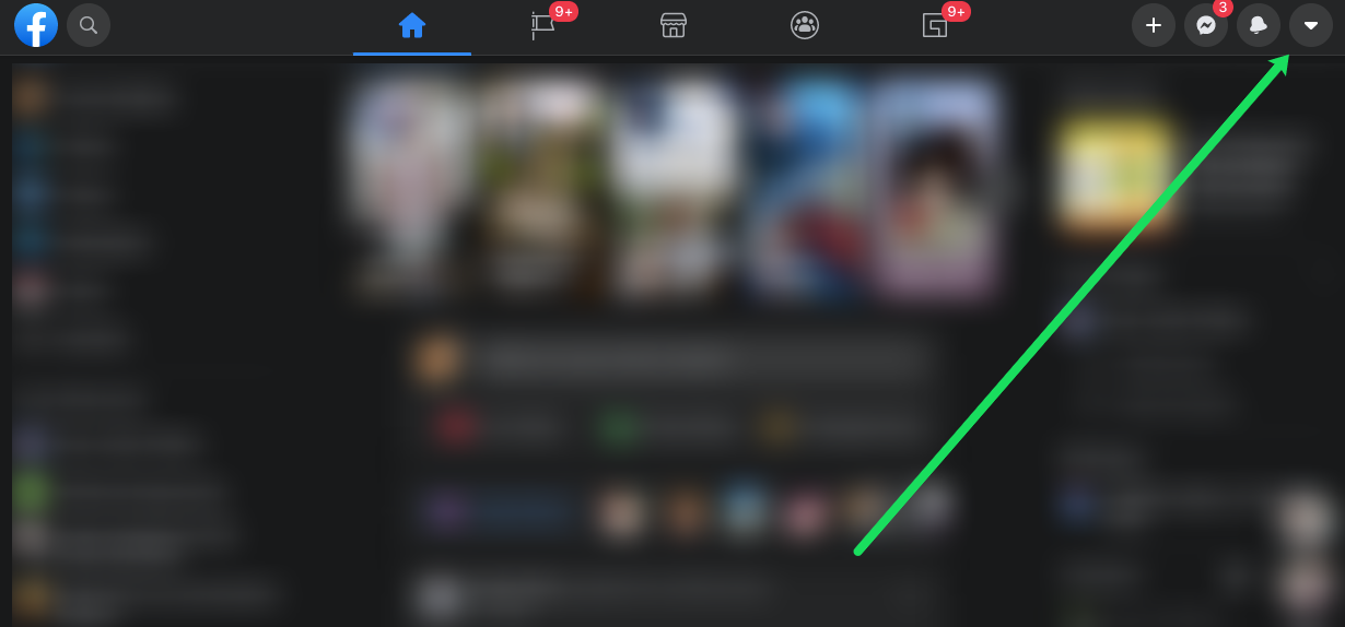 - Click on the downward arrowhead in the top-right section of your profile page or your News Feed page.
