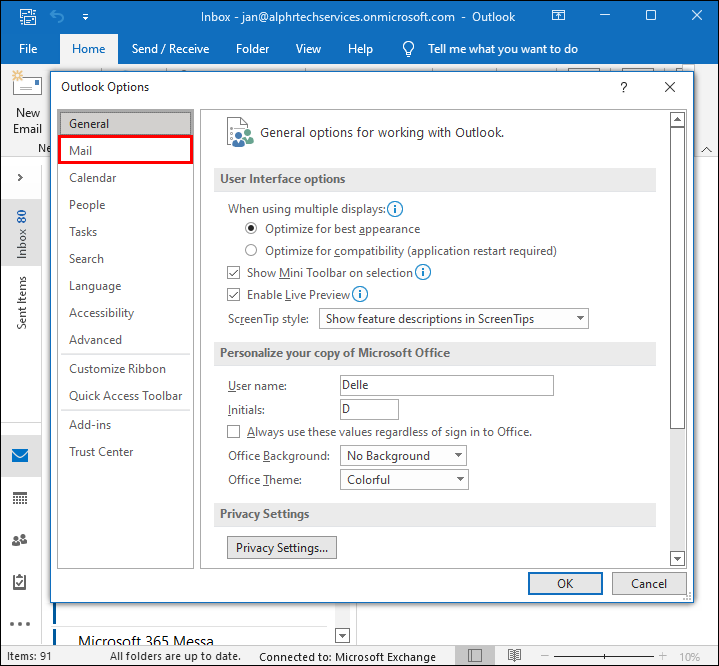- Click File and select Options, then Mail.
