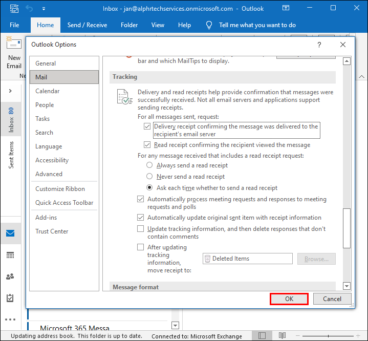 - Check the Request a read receipt for all sent messages checkbox.