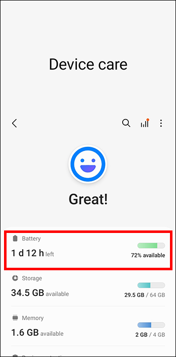- Scroll down and select “Battery.” Please note that this option can be labeled as “Battery and device use” or “Battery use” in some models. In other models, you can find the option under the “Device care” menu.