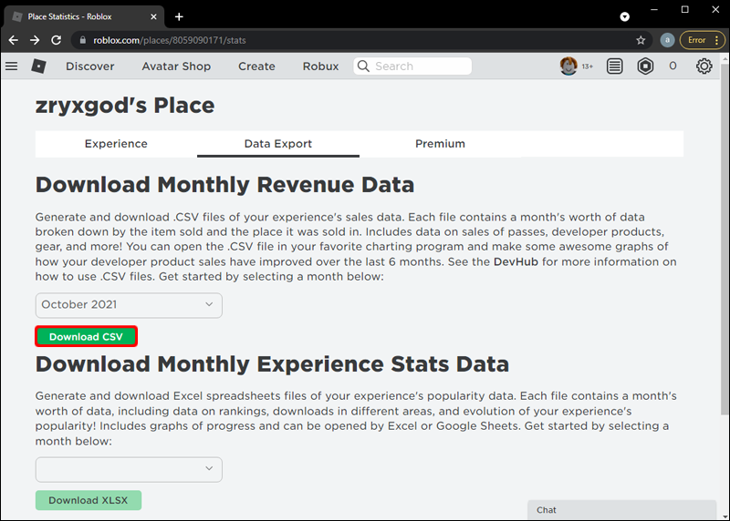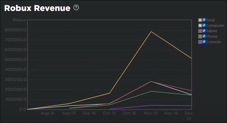 You can also download your stats for a deeper insight. Just download the .csv or .xlsx spreadsheet from the Developer Stats. In the spreadsheet, you can see the number of players that bought specific items on their phone or see the revenue percentage that comes from particular Dev Product sales or Game Passes.