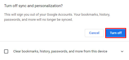 - Click Turn-off to confirm you want to Turn off sync and personalization.