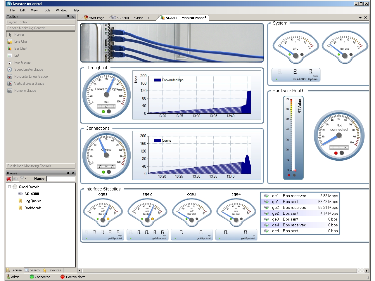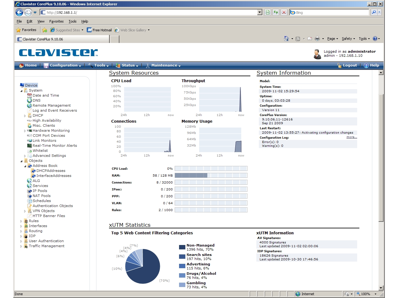 IPS is on the menu and you also get ALGs for FTP, POP3, SIP and H.323. Traffic shaping looks a handy feature as this uses QoS policies to assign rules to pipes that determine bandwidth usage for specific services. Clavister’s optional InControl suite also provides centralised management along with real-time monitoring of selected appliances and a store for security configuration files.