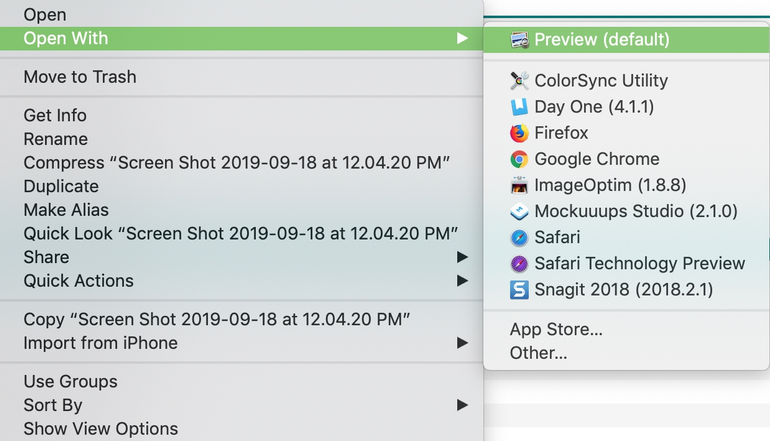 - Select your screenshots, right-click on one, go to “Open With,” and choose “Preview” (the first option at the top of the submenu.)