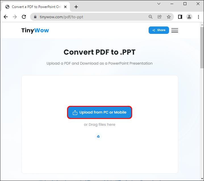 TinyWow is another online FREE tool that is easy to use with high-quality results where you can open through PCs or Mobile. One of its use is to convert PDF to Powerpoint presentations and here’s how: