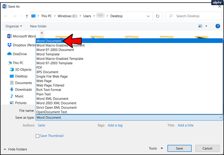- Then, select either Word Document .doc or .docx from the dropdown menu.