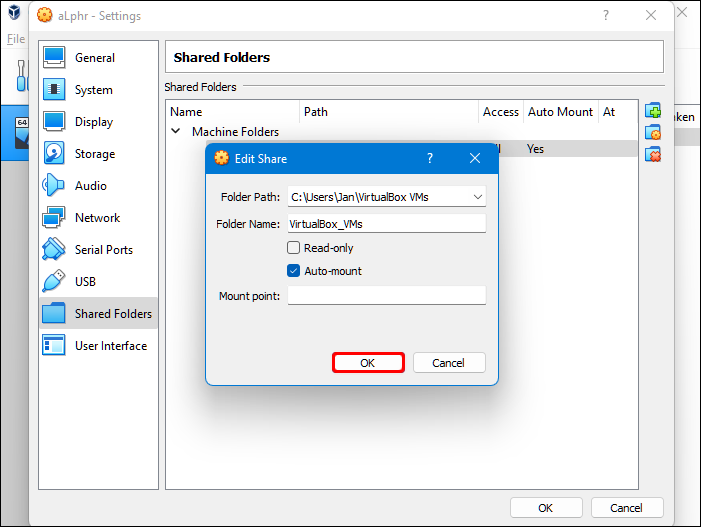 - Ensure that the shared folder is available when you run the VM. To achieve this, check the “Auto-mount” box before confirming your choices.