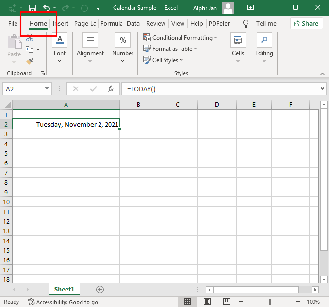 - In row 1, select any cell and type “=TODAY()” in the formula field. This will display the current date in the selected cell.