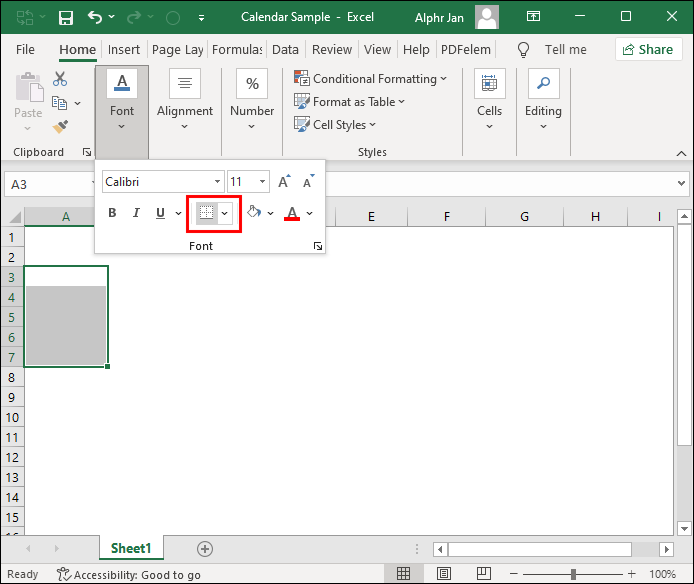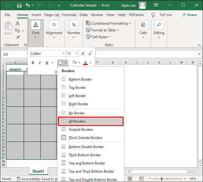 - Highlight the weekdays row and select “All Borders” from the “Borders” menu to finish up the grid.