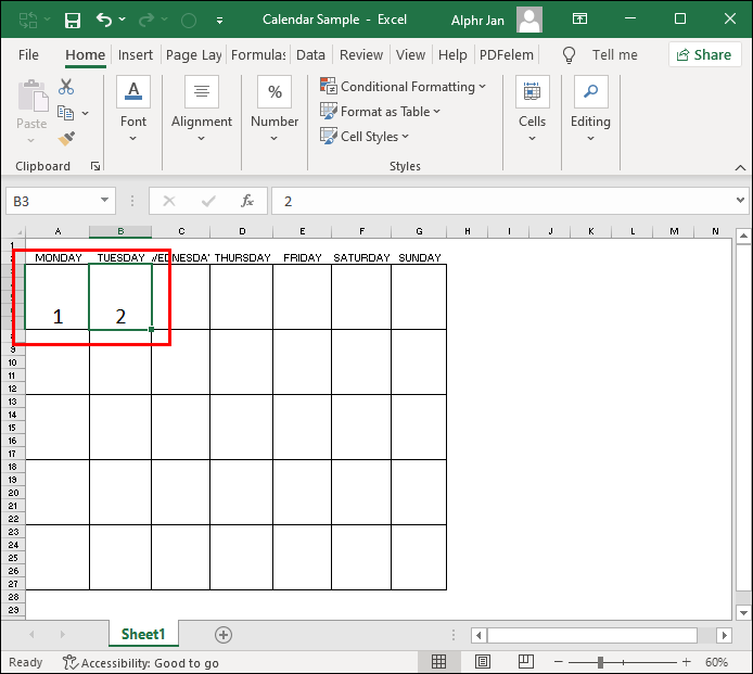 - Repeat the process for the rest of the table. You’ll need to enter dates for the first two days of each week manually.