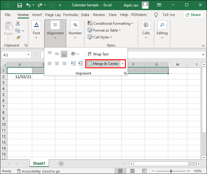 - Select cells A1-G1 and choose the “Merge & Center” option from the “Alignment” menu. This will create a month title.