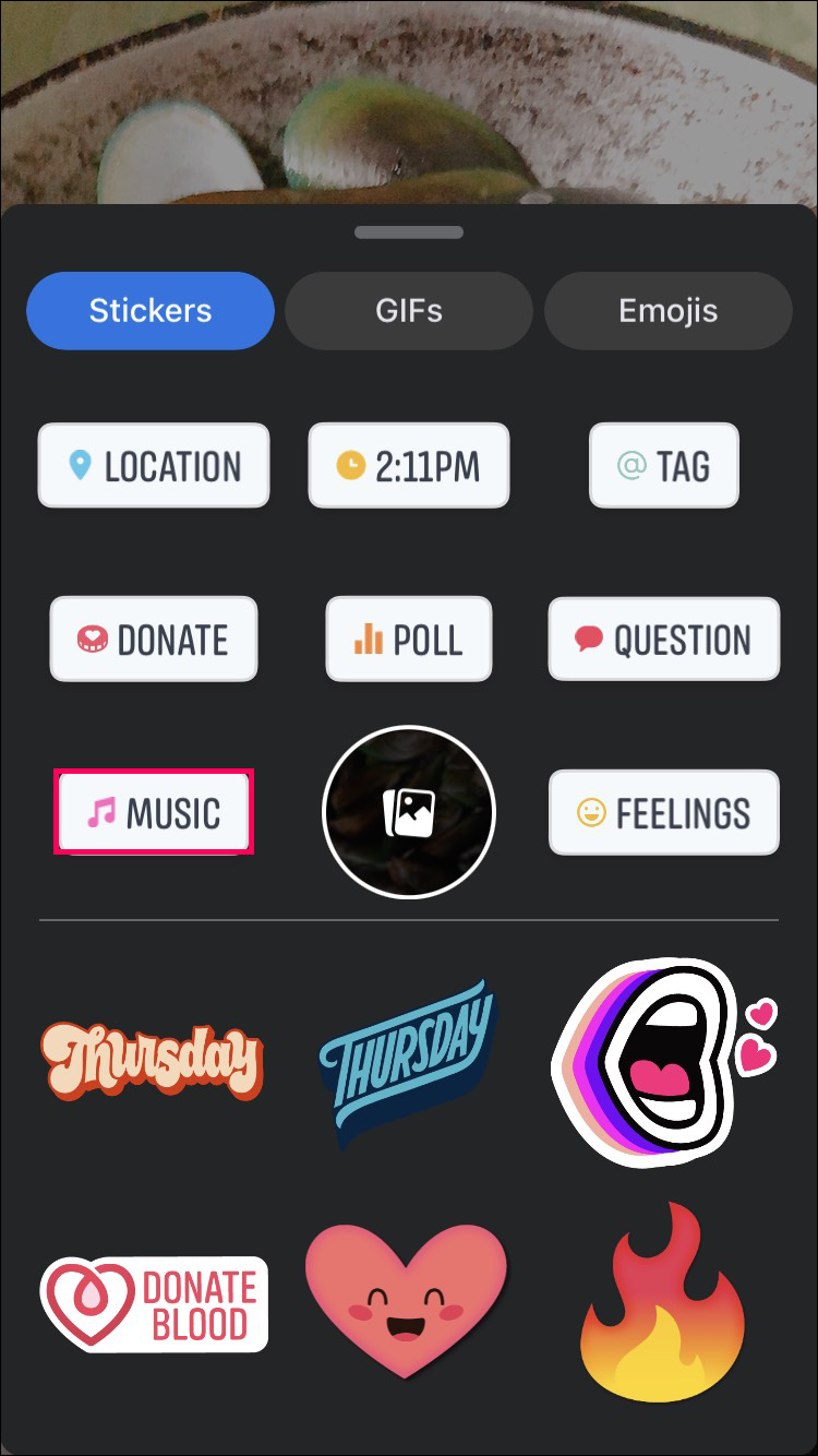 - Tap the sticker button and choose the “Music” sticker.
