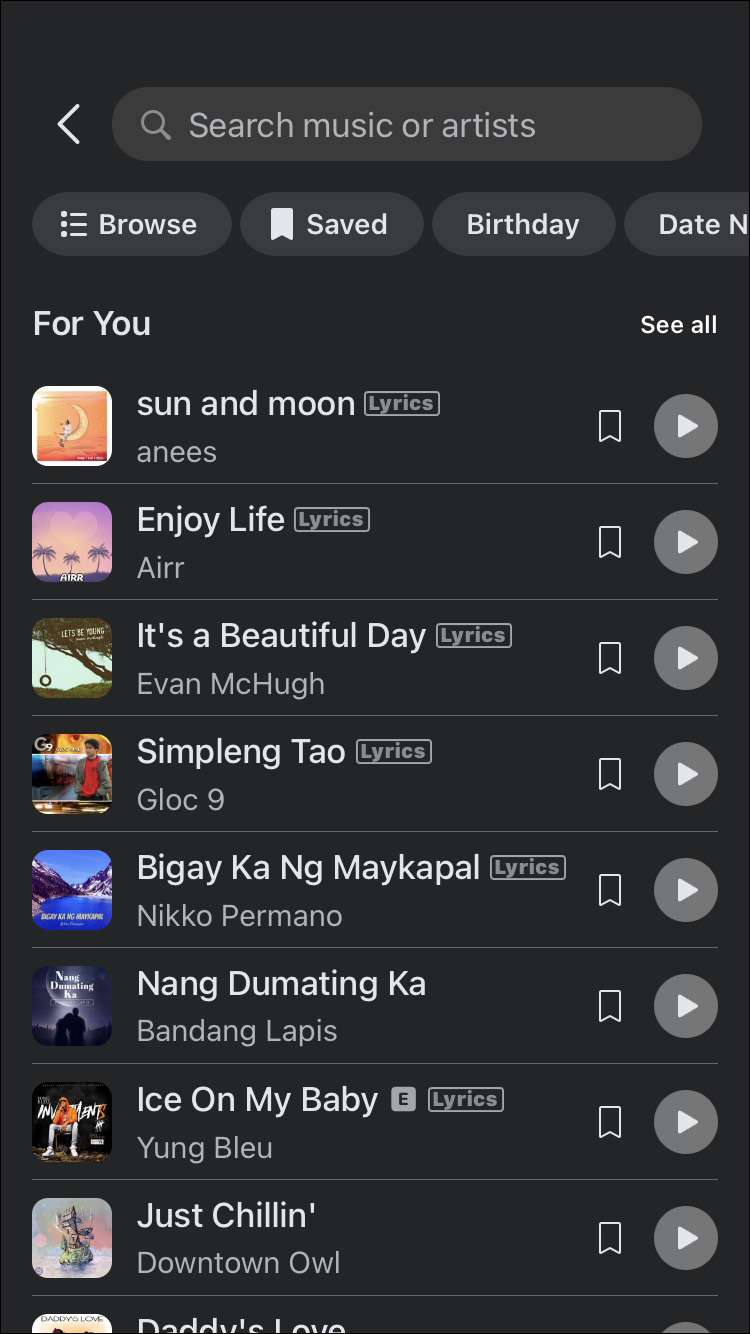 - A playlist will pop up, which you can browse. If you already know the song you want to share, use the search bar to find it.