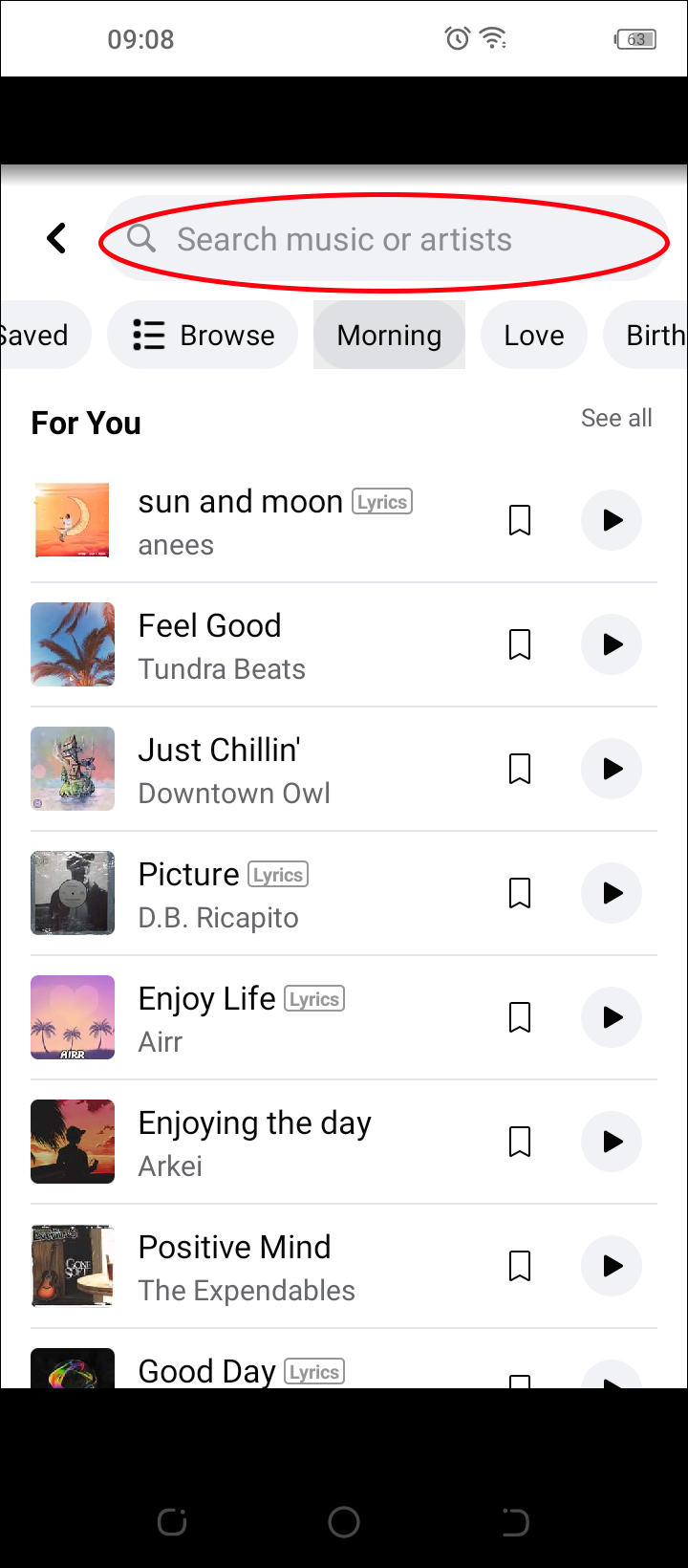 - A playlist will appear. Browse for music by category or search for a specific song in the search bar.