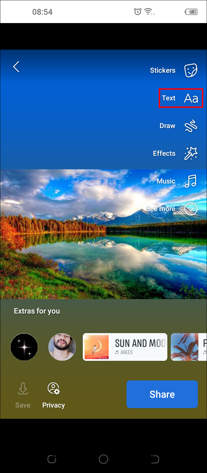 - Tap the “Aa” button to add stickers, effects, or text.