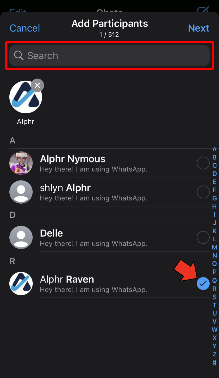 - You’ll need to select the contacts you want to add to your new WhatsApp group. Search for contacts and simply tap them to add them to the list.
