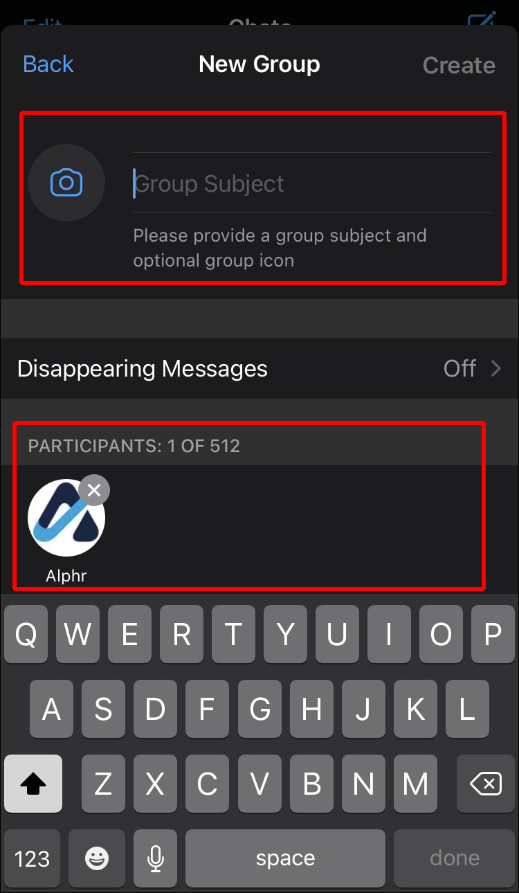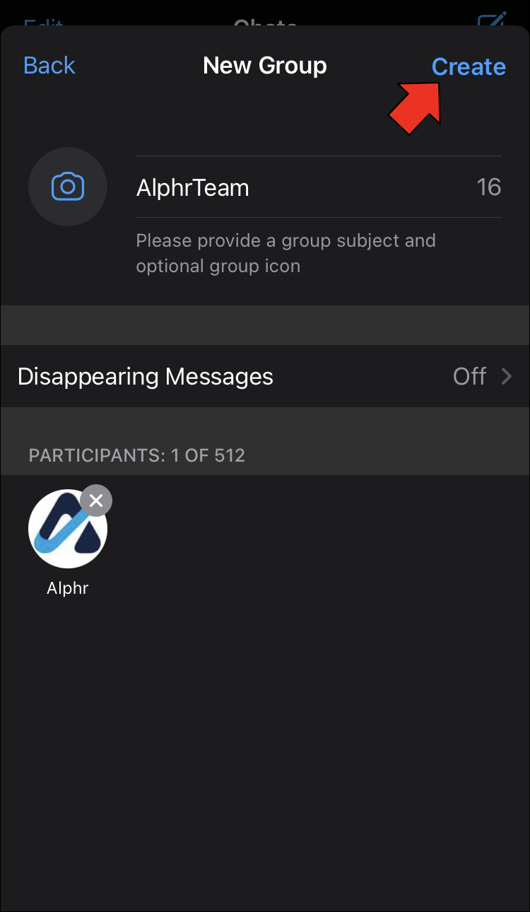 - Tap the “Create” button in the top right corner to finalize your new WhatsApp group.