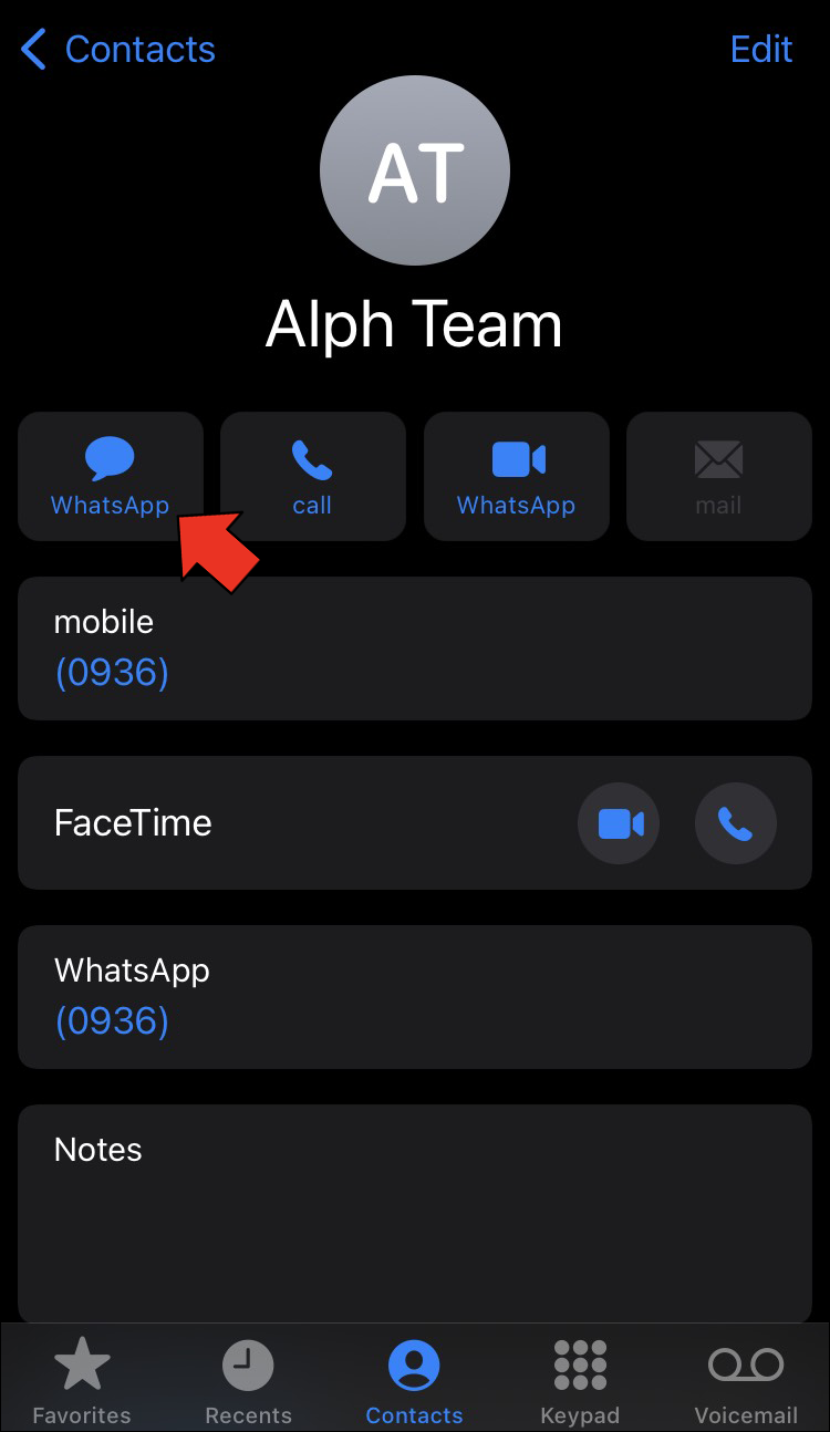 - Start a WhatsApp conversation with yourself by tapping the WhatsApp button on the contact page.