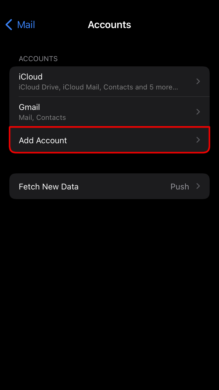 - Scroll down until you see “Mail” then go to “Accounts.”