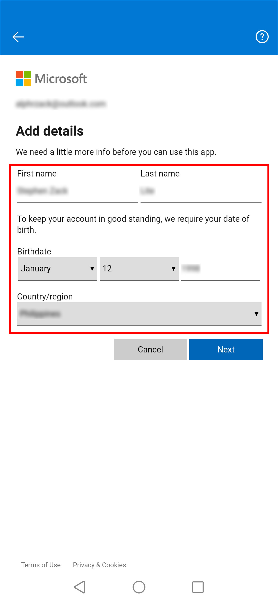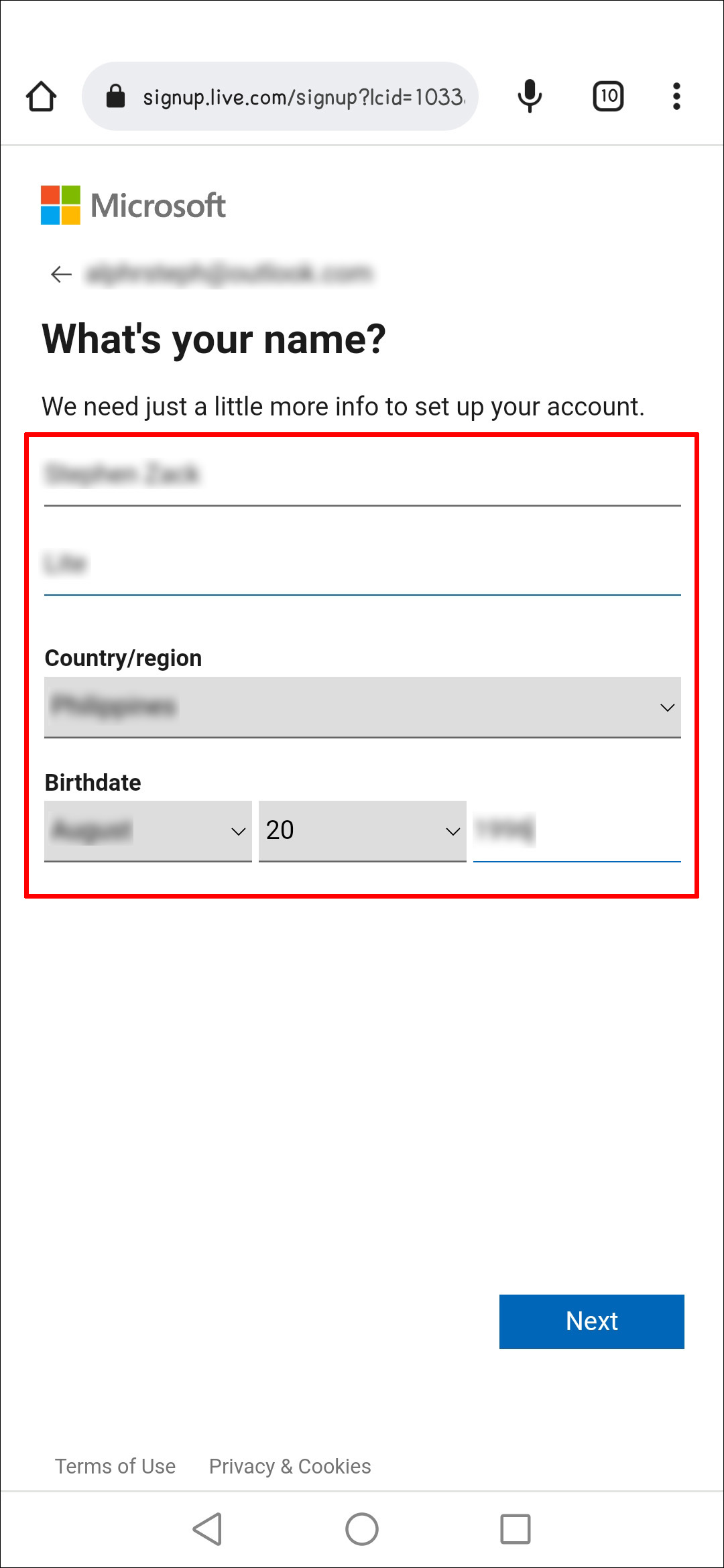 - You will then be asked to fill in additional details. This includes your full name, date of birth, and your country and region.