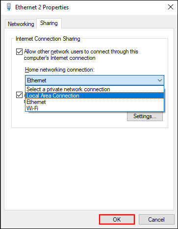 - From the dropdown menu, select the “Local Area Connection” noted down earlier.